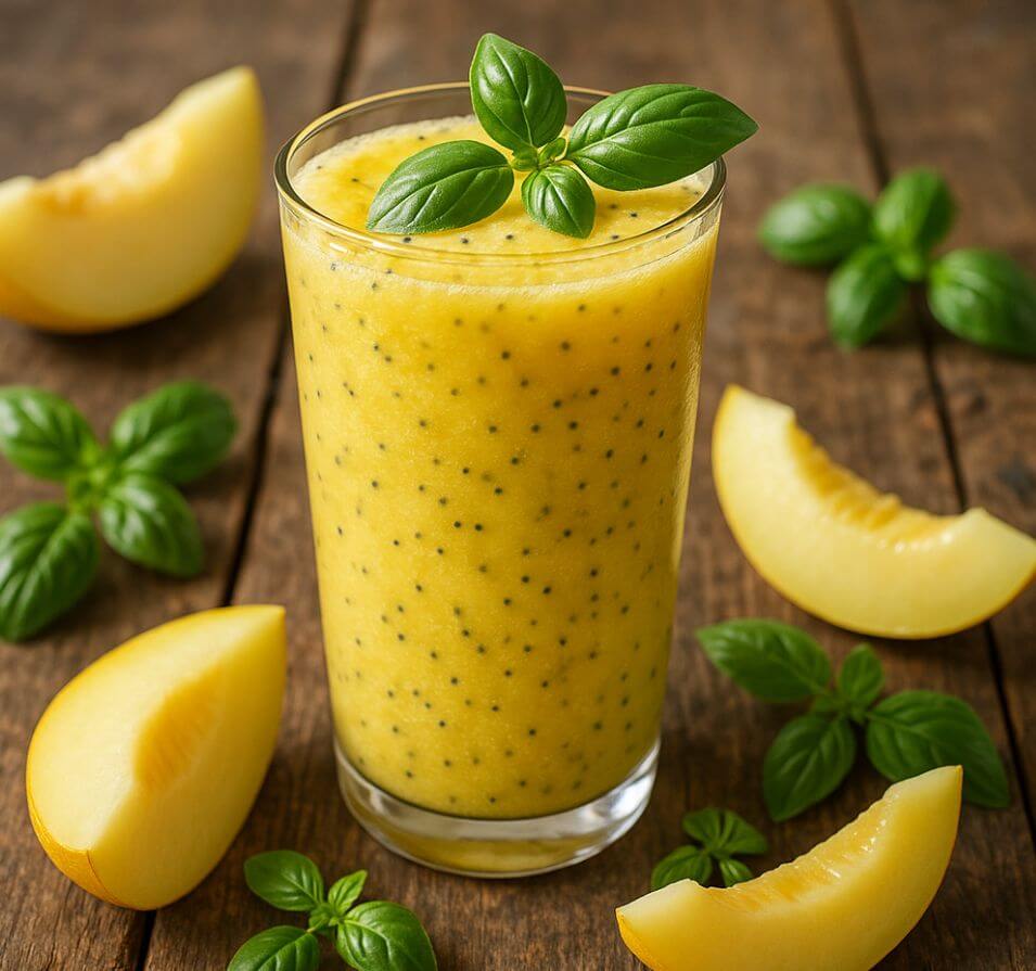 Смузі з динею, базиліком і насінням чіа — це поєднання свіжості, аромату та користі. Літня диня додає напою природної солодкості та гідратації, базилік дарує трав’янистий аромат, а чіа збагачує його клітковиною та омега-3. Ідеальний варіант для сніданку, перекусу або як здоровий десерт у спеку.