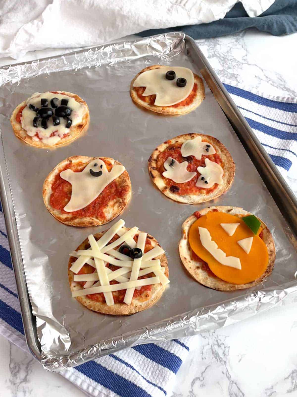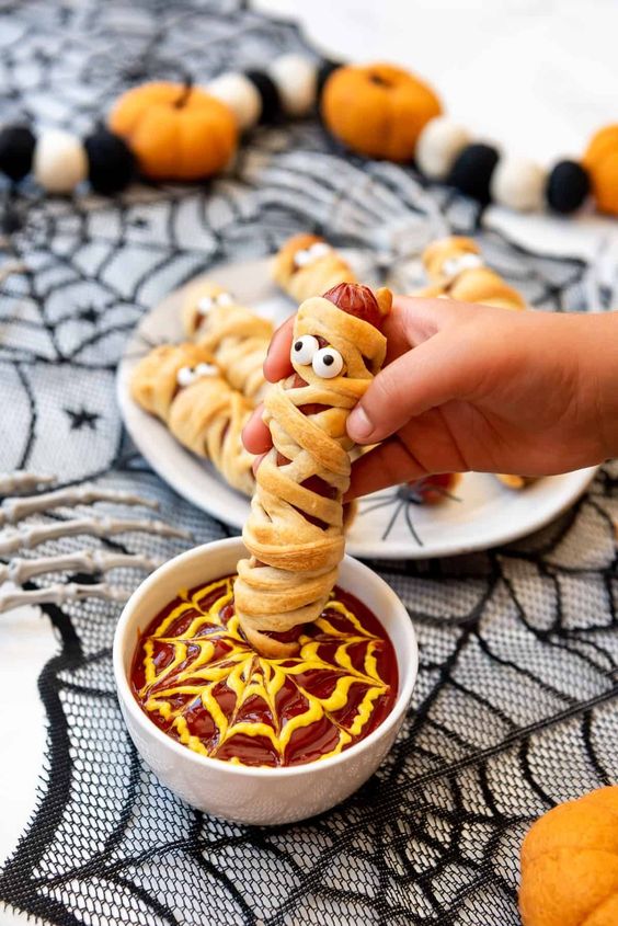 6) Для оформлення використовуйте невеликі краплі м'якого сиру як очі, а очі мумій можна зробити зі шматочків оливок.
