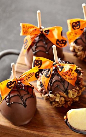 4) Закінчуючи творити свої маленькі кулінарні шедеври, ви можете додати страшні або навіть смішні мордочки з цукерок, горіхів і шоколаду. Вони додадуть вашим яблукам неперевершений шарм.