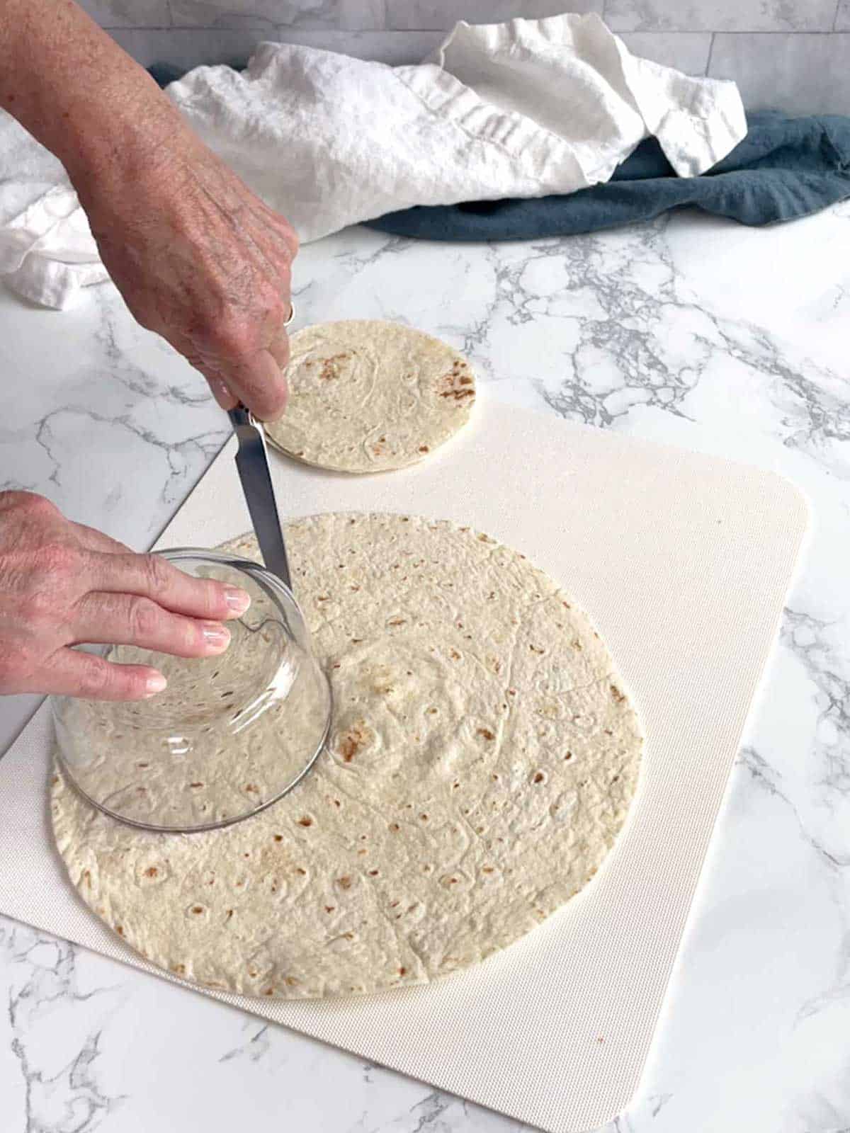 1) Вирізати кружечки з тортилії. Діаметр, який буде зручний для вас.